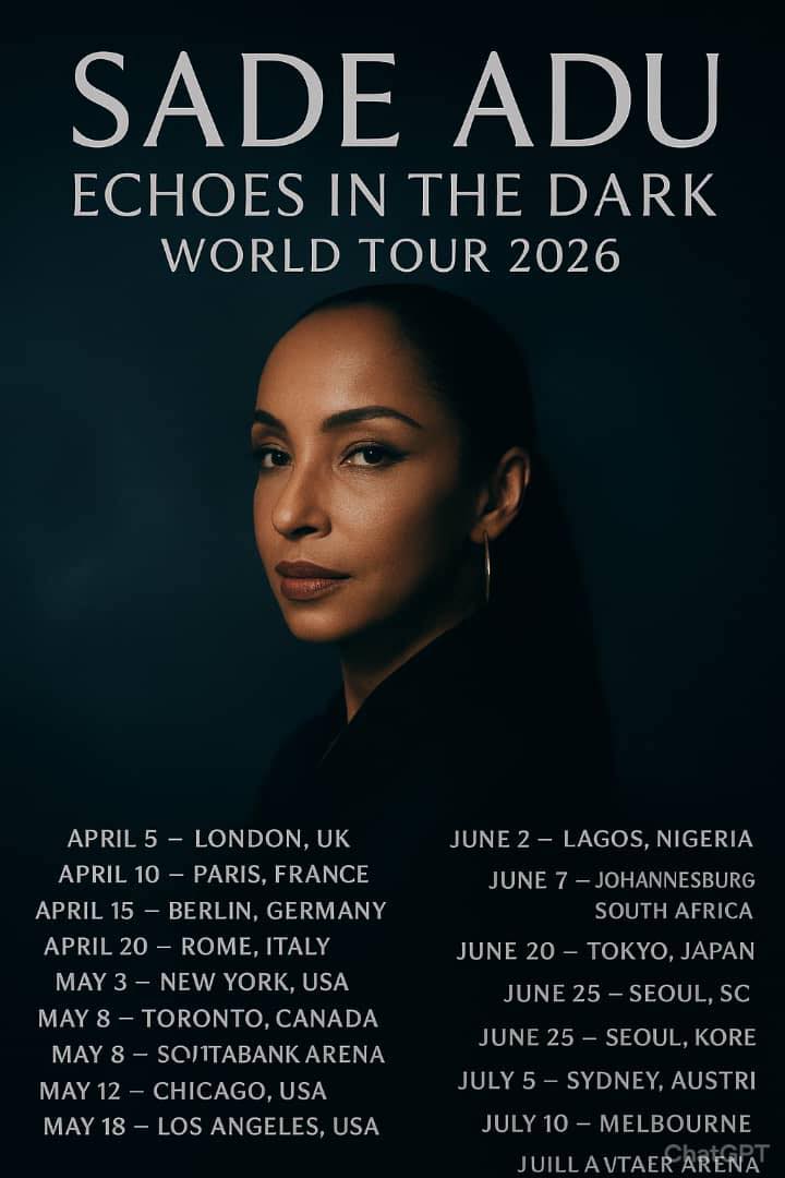 Ultimately, the news of Sade Adu’s 2026 tour is a celebration of her legacy, her artistry, and her unwavering commitment to music that touches the soul. Fans across the world can look forward to witnessing the elegance, power, and emotional resonance that have defined her career for decades. The “Echoes in the Dark” tour is more than a series of concerts—it is a journey into the heart of one of the most iconic voices of our time, offering a rare chance to experience music in its most captivating form. As the anticipation builds and the dates approach, the world prepares once again to be moved by the incomparable Sade Adu, whose music, much like her presence, continues to echo in the hearts and minds of millions worldwide.